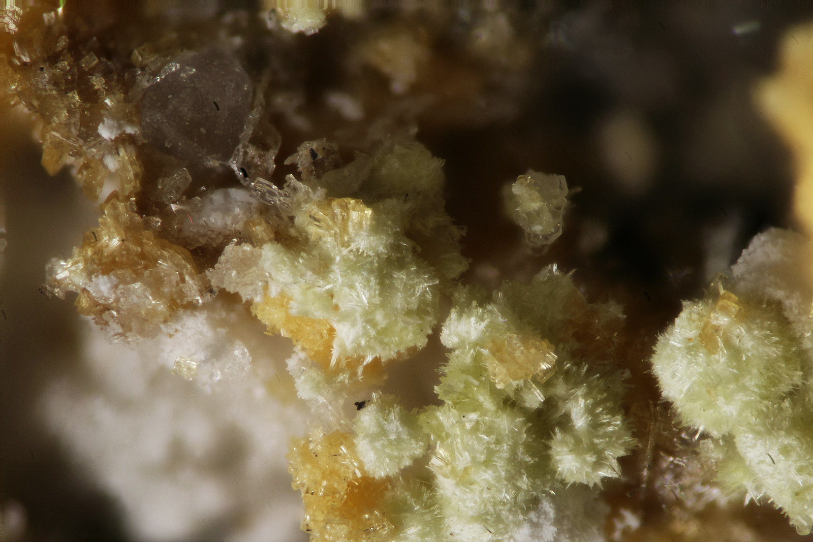 Adranosit-(Fe), Halde der Zeche Alstaden, Duisburg, Bildbreite ca. 1.5mm