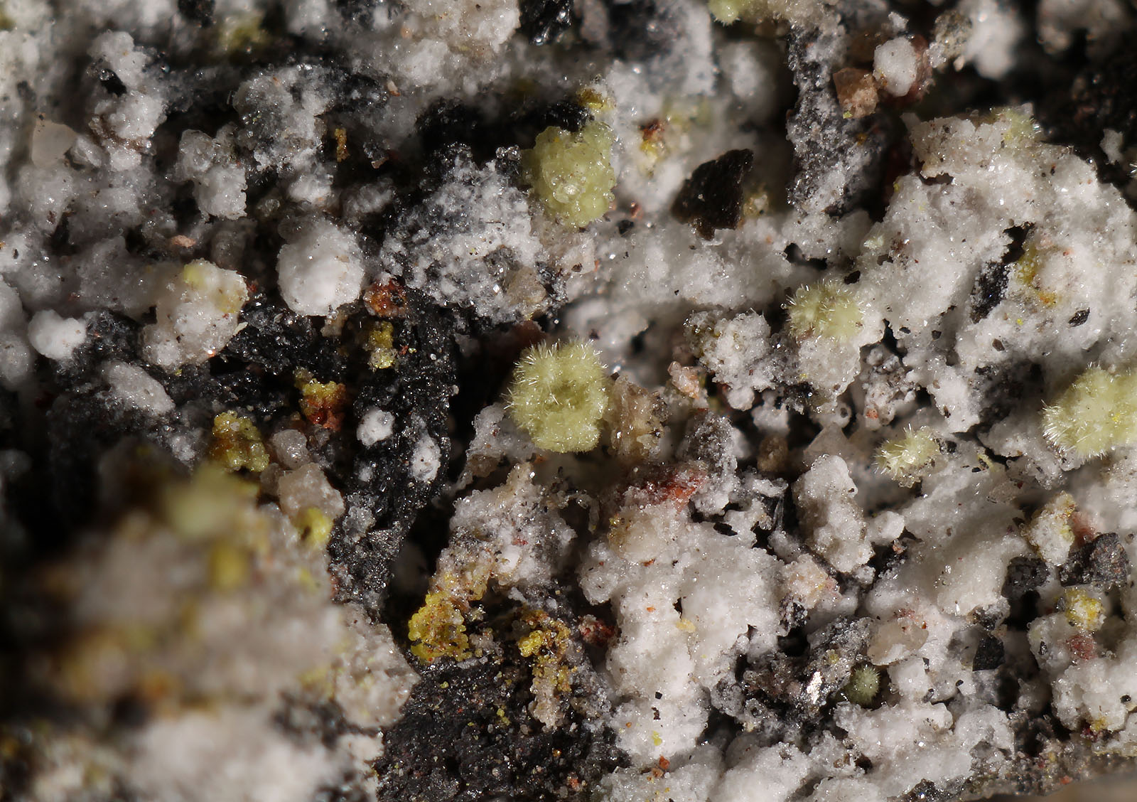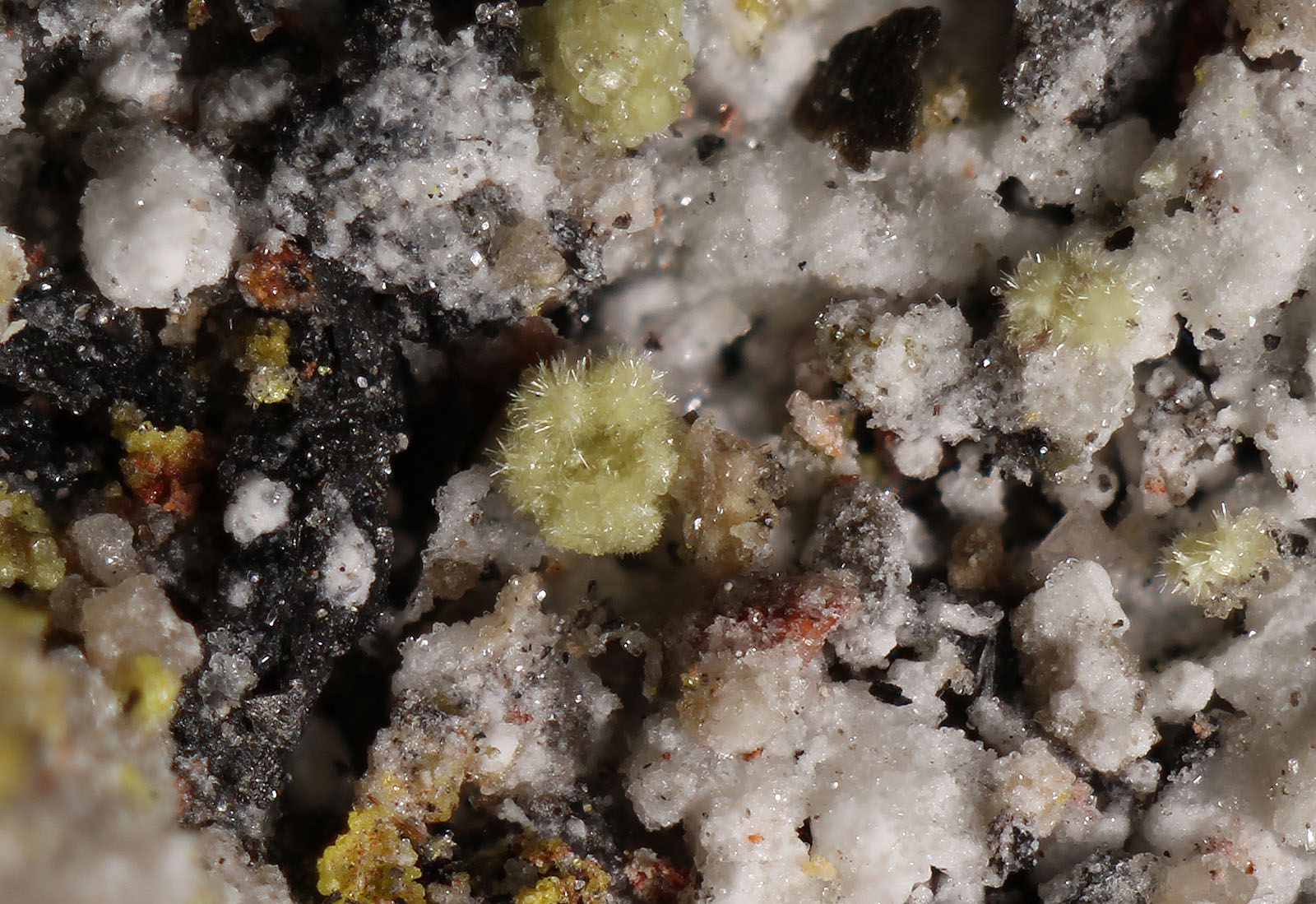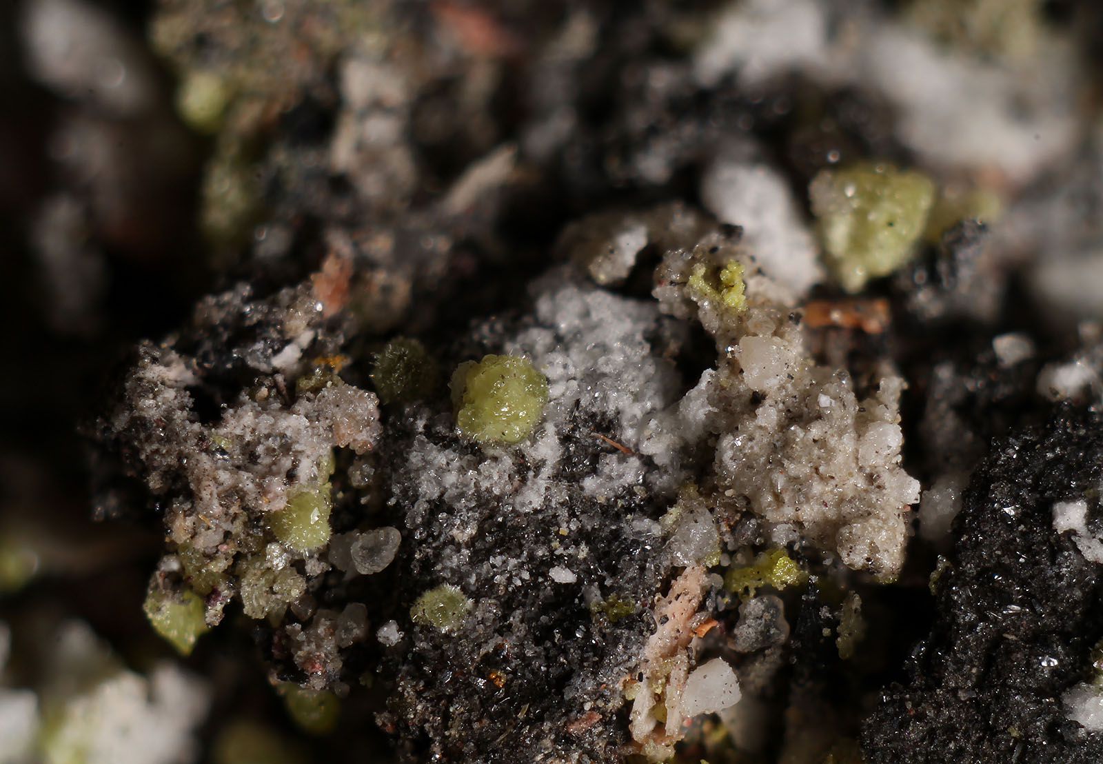 Eigentlich sollte der Adranosit-Fe „Alstadenit“ heißen. Doch leider haben wir dem Mineral damals keine weitere Beachtung geschenkt, sodaß die Phase zuerst am La Fossa-Krater der Insel Vulcano in Italien beobachtet und analysiert wurde. Später kam noch die schon genannte Grube Anna/Alsdorf hinzu. Und bei der Durchsicht der gesammelten Werke von W.Vertacnik fielen mir dann diese Adranosit-Fe-Aggregate auf. Die Bestimmung ist rein visuell, doch ist die Ähnlichkeit mit Material von Anna und La Fossa einfach zu groß um eine andere Phase annehmen zu müssen.