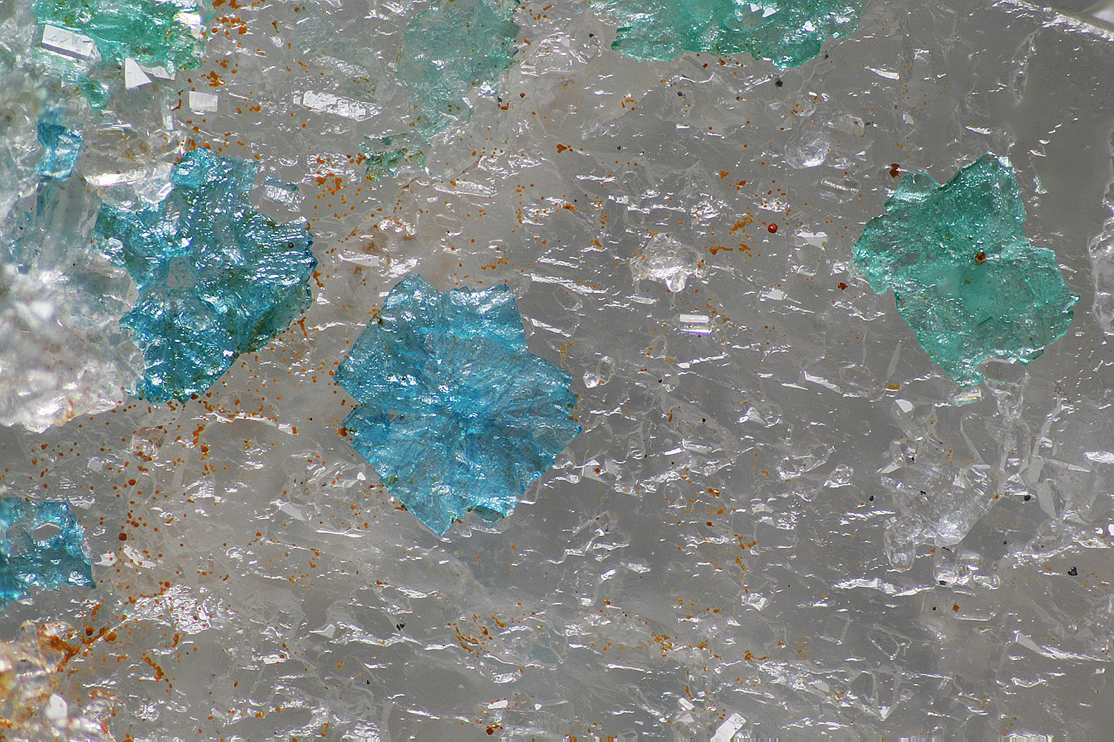 Dann schlug das Glück unbarmherzig zu. Es gelang mir einige wenige Micromounts dieses Minerals zu erwerben. Die Bröselchen, anders kann man das nicht nennen, zeigen auf Barytspaltflächen aufsitzende plattgedrückte hellblaue xx von max. 1/4mm Größe.