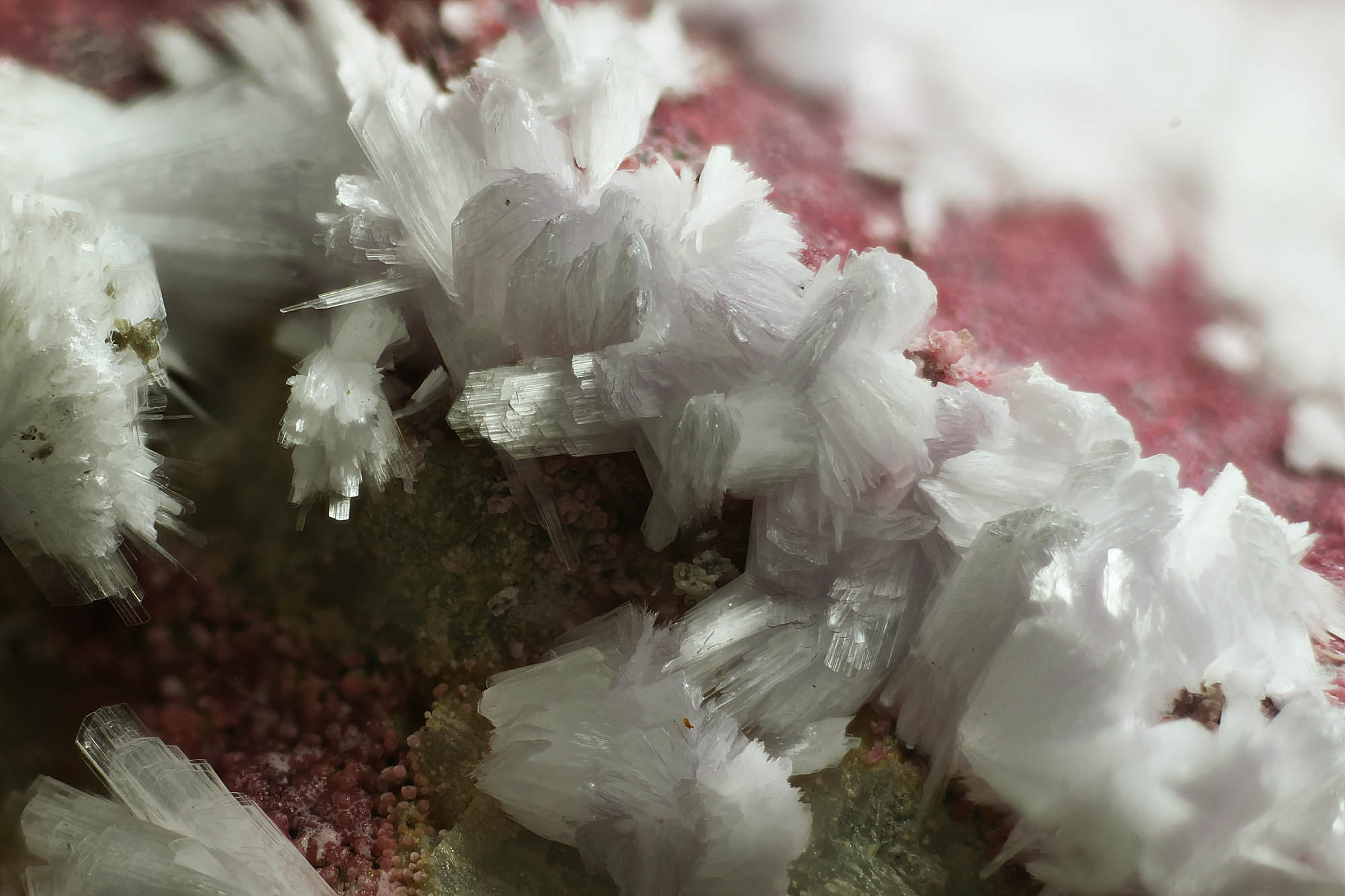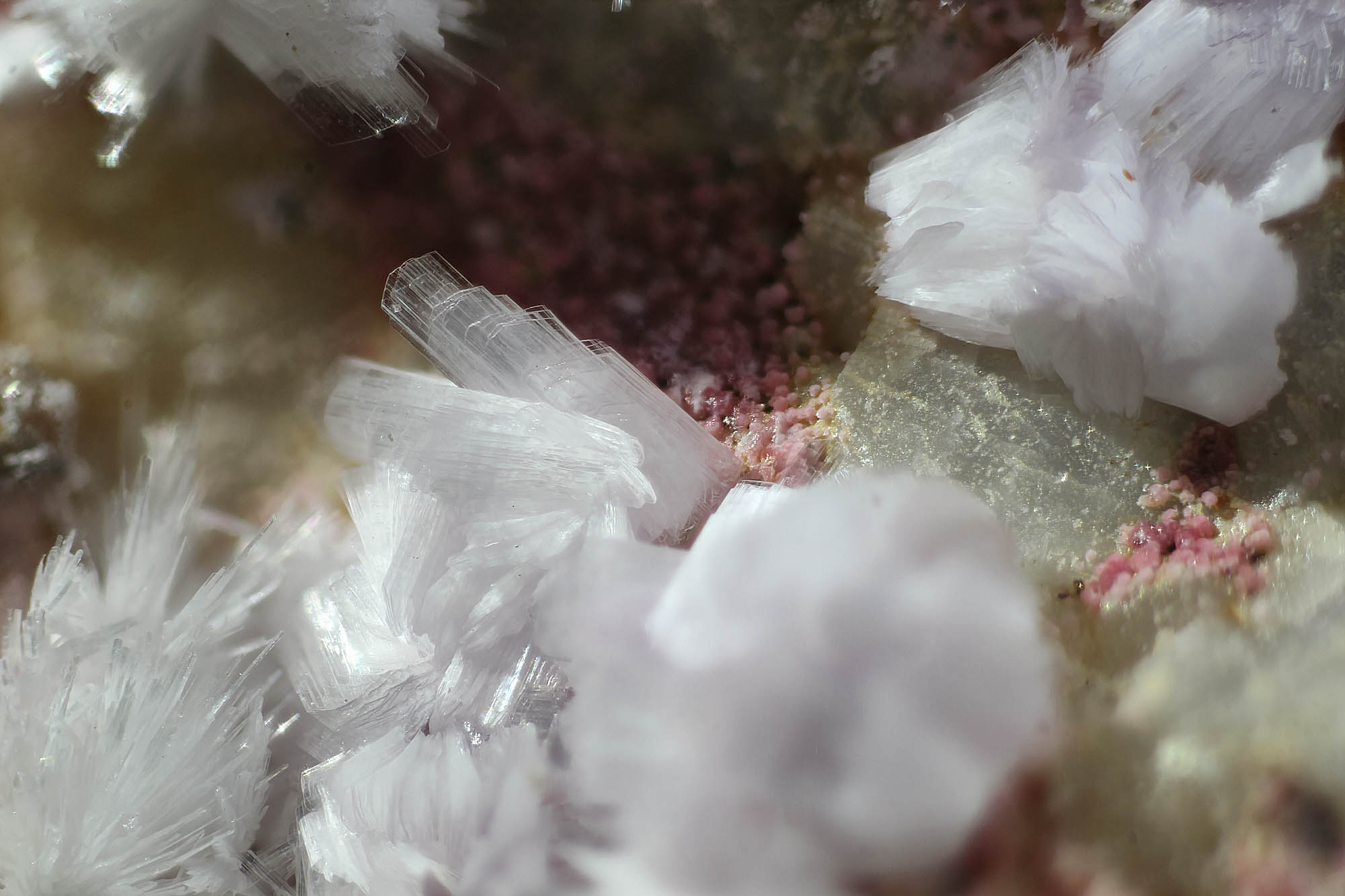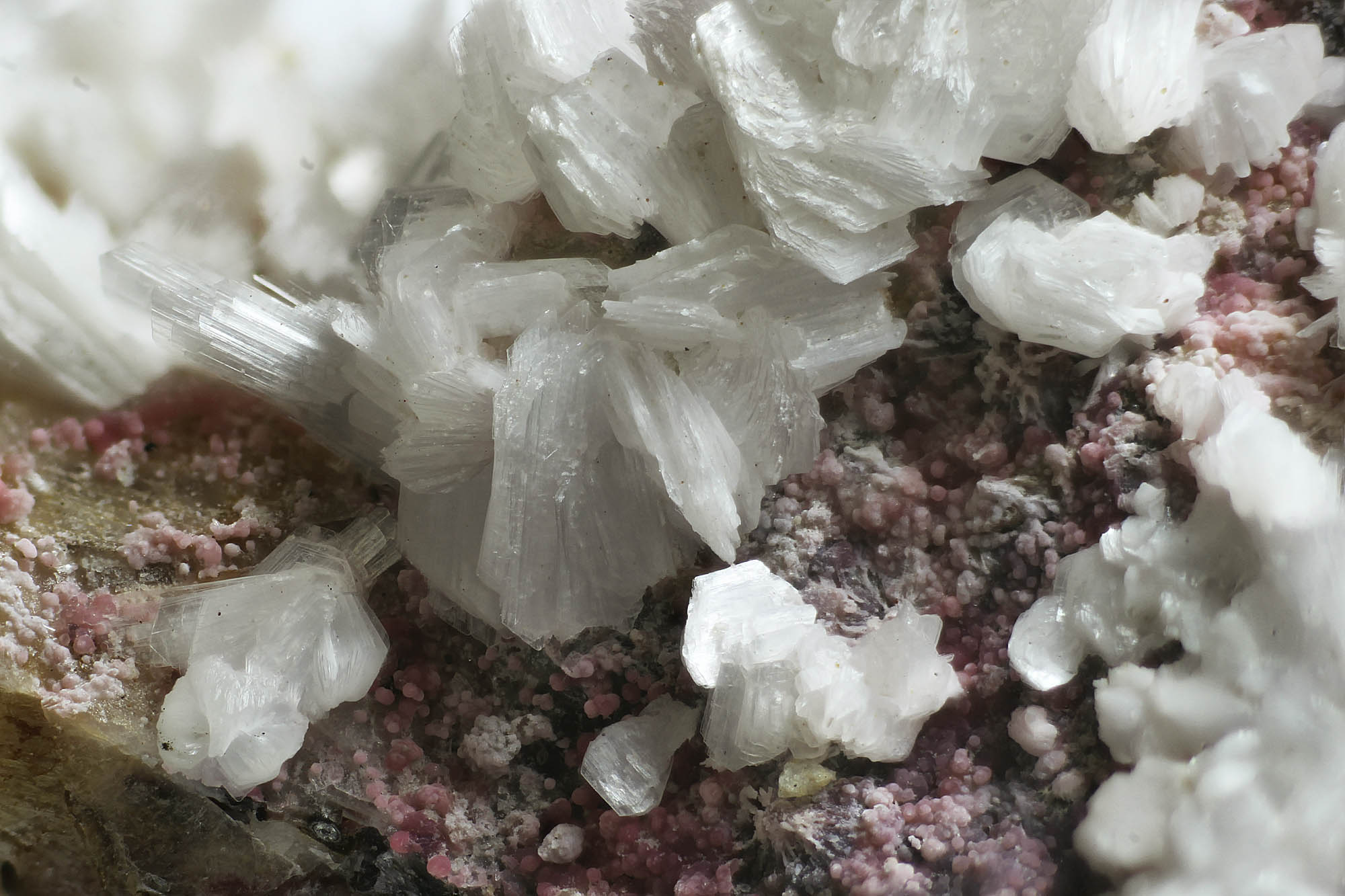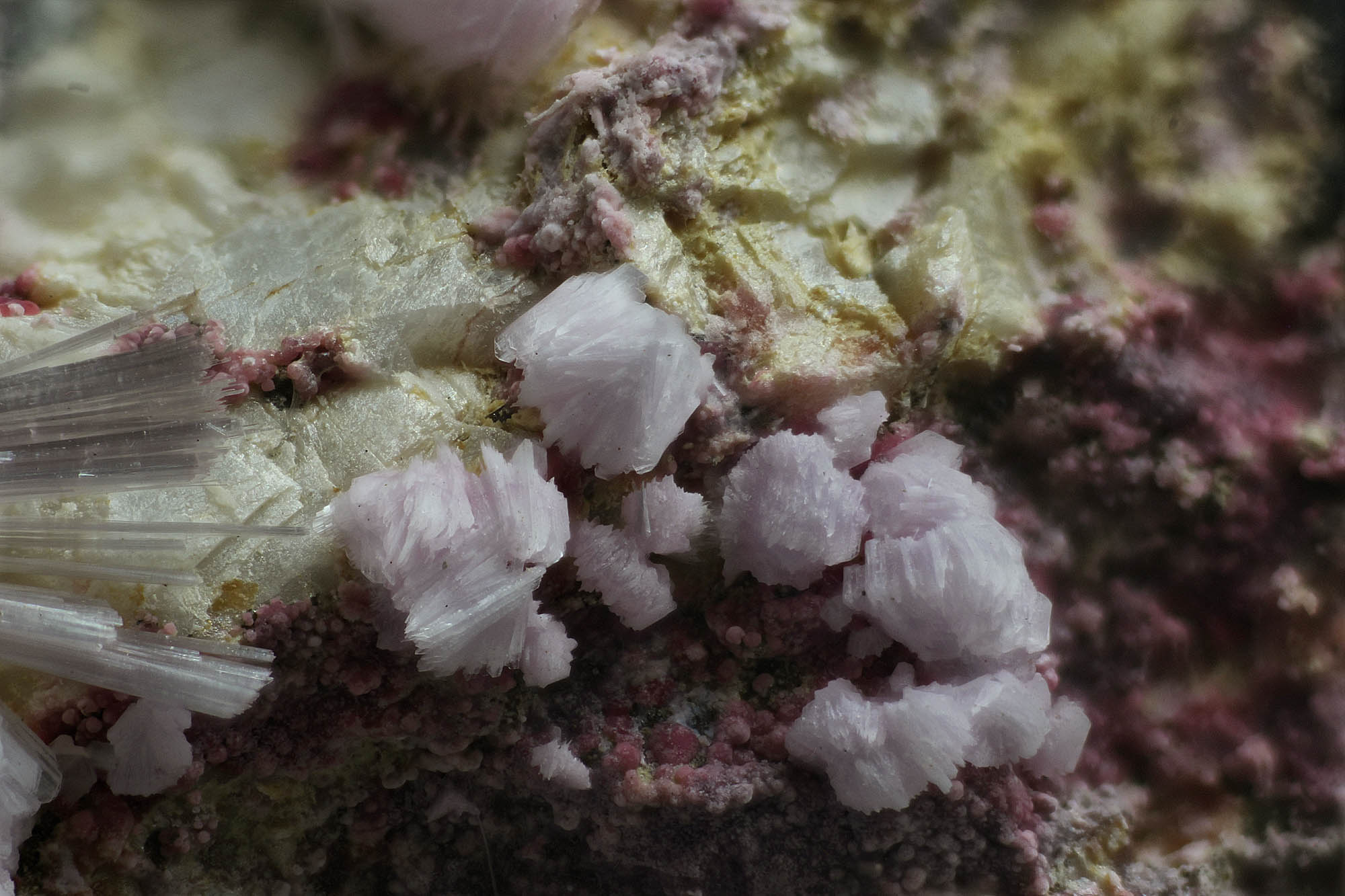 Typisches Guerinit-Aggregat mit Pikropharmakolith (feinnadelig) und lattigen Guerinit-Aggregaten, Bildbreite ca. 4mm