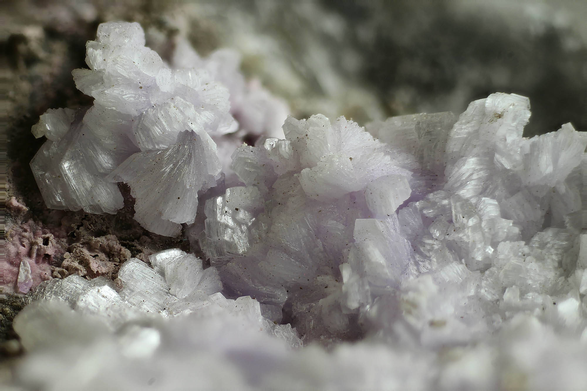Zart fliederfarbene Aggregate aus sechsseitigen Blättchen, derart gefärbte Aggregate sind selten, Bildbreite ca. 6mm, Sammlung Döhnel-183