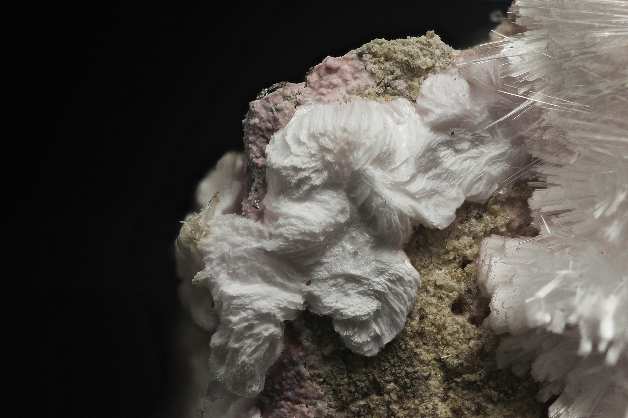 Hier sieht man schön wie die lattigen Kristalle Aggregate bilden. Diese sind wesentlich aufgelockerter als die der kurztafeligen Blättchen., Bildbreite ca. 5mm, Sammlung Döhnel-122
