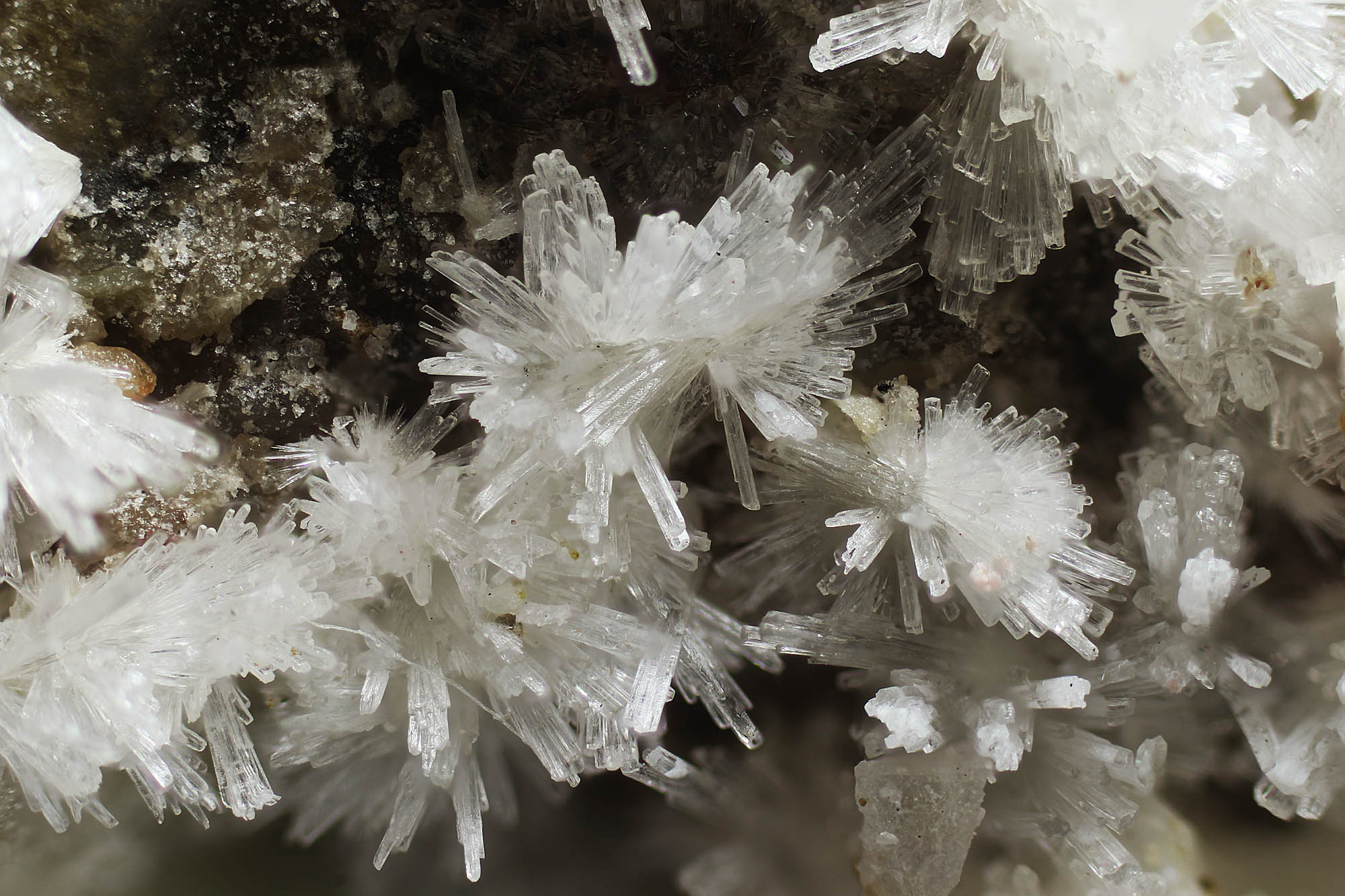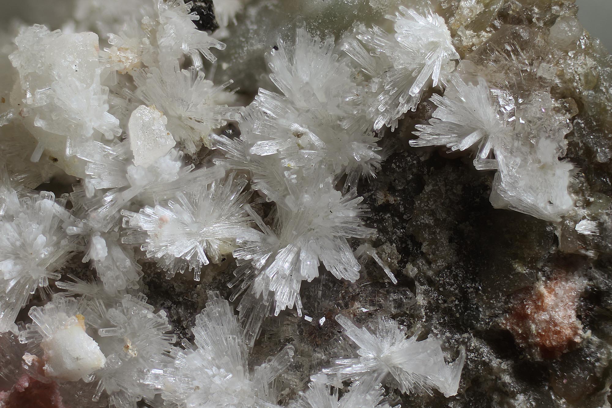 Gut zu erkennen die radialstrahligen farblosen klaren Sonnen des Pharmakolith, Bildbreite ca. 4mm, Sammlung Döhnel-104
